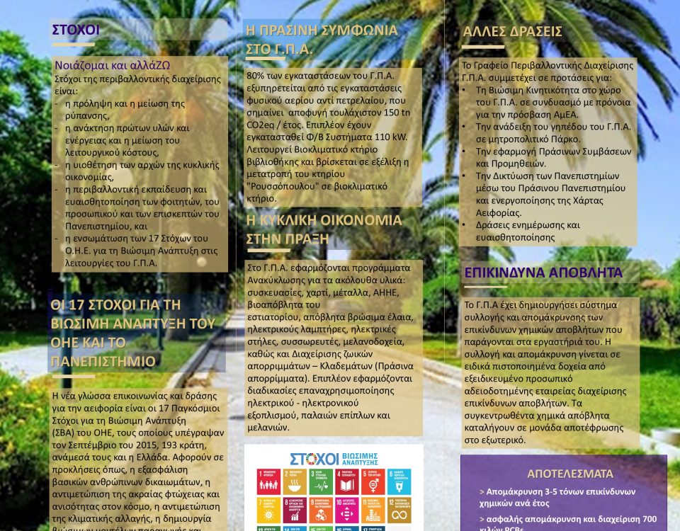 Το Γραφείο Περιβαλλοντικής Διαχείρισης Γ.Π.Α. ξεκίνησε τη λειτουργία του το 2007 με απόφαση του αείμνηστου Λεωνίδα Λουλούδη ως αντιπρύτανη Γ.Π.Α. Αποτέλεσε μια πρωτοπορεία του Γ.Π.Α. στο […]